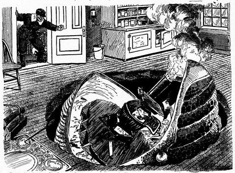 Working frantically, he pushed the center burner to the middle of the room right over the hole he had cut in the floor. Then he built a fire in it, starting it with a liberal supply of coal-oil. He soon had the stove red hot. Opening the door he again filled the stove with oak and then ran for the steps. He was just in time. The floor, cut through, disappeared into the Thing's maw and with it the redhot stove. Staples yelled in his glee, "A hot pill for you this time, a HOT PILL!"